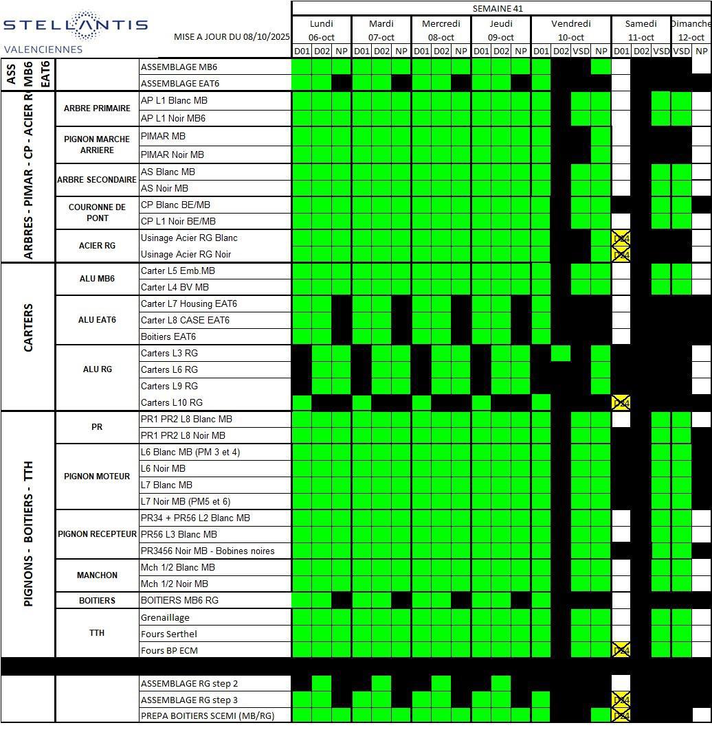 La situation des demandes clients nous amène à revoir l’activité comme suit, annulation de la séance de travail supplémentaire du samedi 11 octobre 2025 (équipe D01) pour les secteurs suivants :