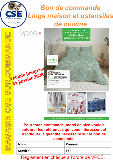 Sur le nouveau bon de commande, catalogue VPCE avec du linge de maison et des ustensiles de cuisine, etc..