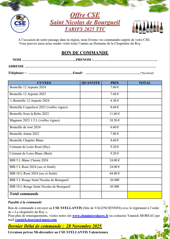 Nouveau bon de commande pour le vin de Saint Nicolas de Bourgueil.