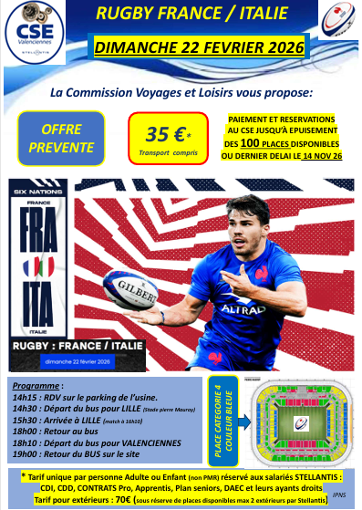 Le match de Rugby France/Italie, le dimanche 22 février 2026.