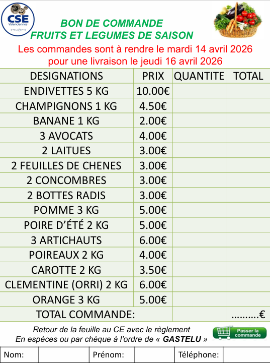 Votre CSE vous informe du nouveau bon de commande pour les fruits et légumes, celui-ci est à rendre avant: