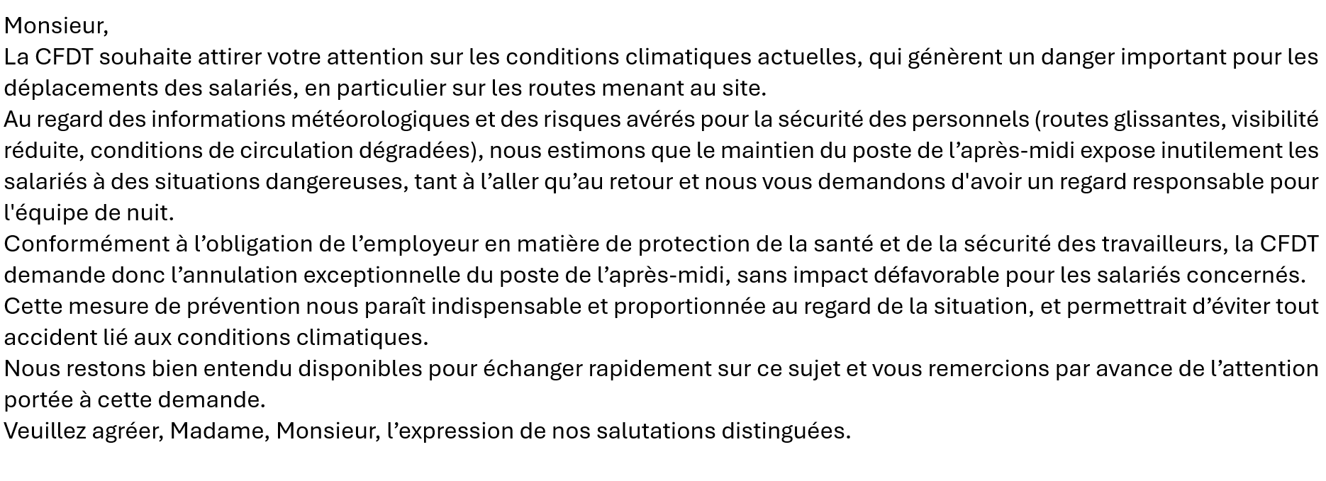 Courrier CFDT : Demande d’annulation de la séance en raison des intempéries